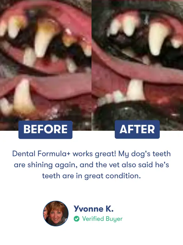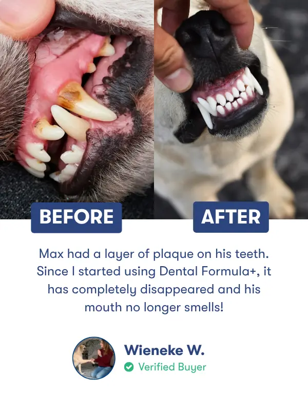 “The Dental Formula+ works really well! My dog always had a lot of tartar on her teeth, and brushing was nearly impossible. Now she’s allowed to lick my face again — before, the smell made that impossible!”